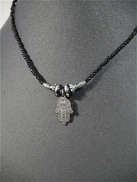 Collier ethnique artisanal 1 rangée de perles fines noires 2mm agrémentées d'une breloque en forme de main - khamsa Vetement & Accessoire