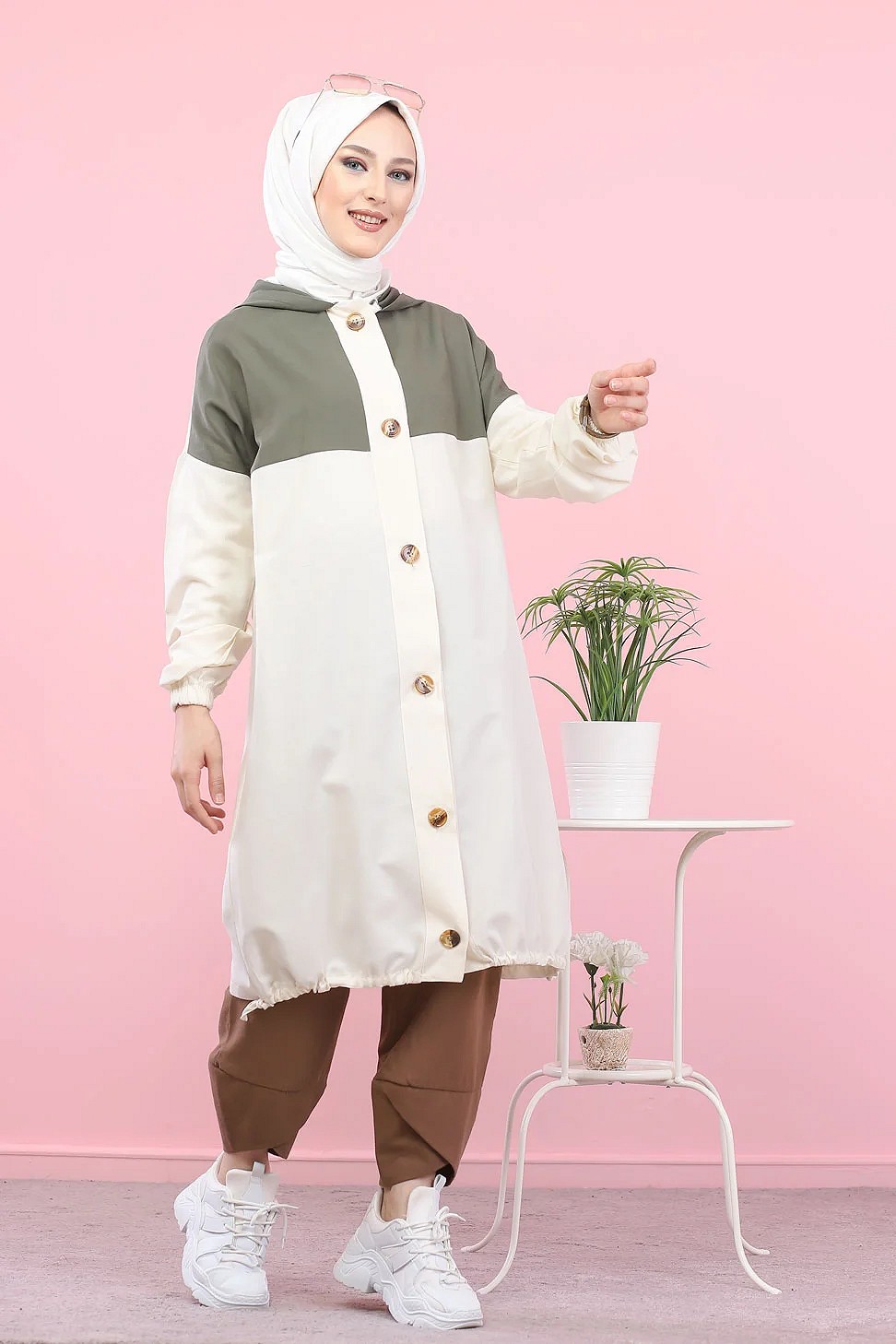Veste mi longue, capuche, fermeture boutons sur toute la longueur, manches finition élastique, liens de serrage à la base. Coupe droite, tissu effet tissé aspect lin.