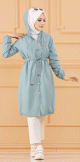 Description: mi-cuisse à l'avant et longueur au genou derrière; col mandarin ouvert ; poignets boutonnés;