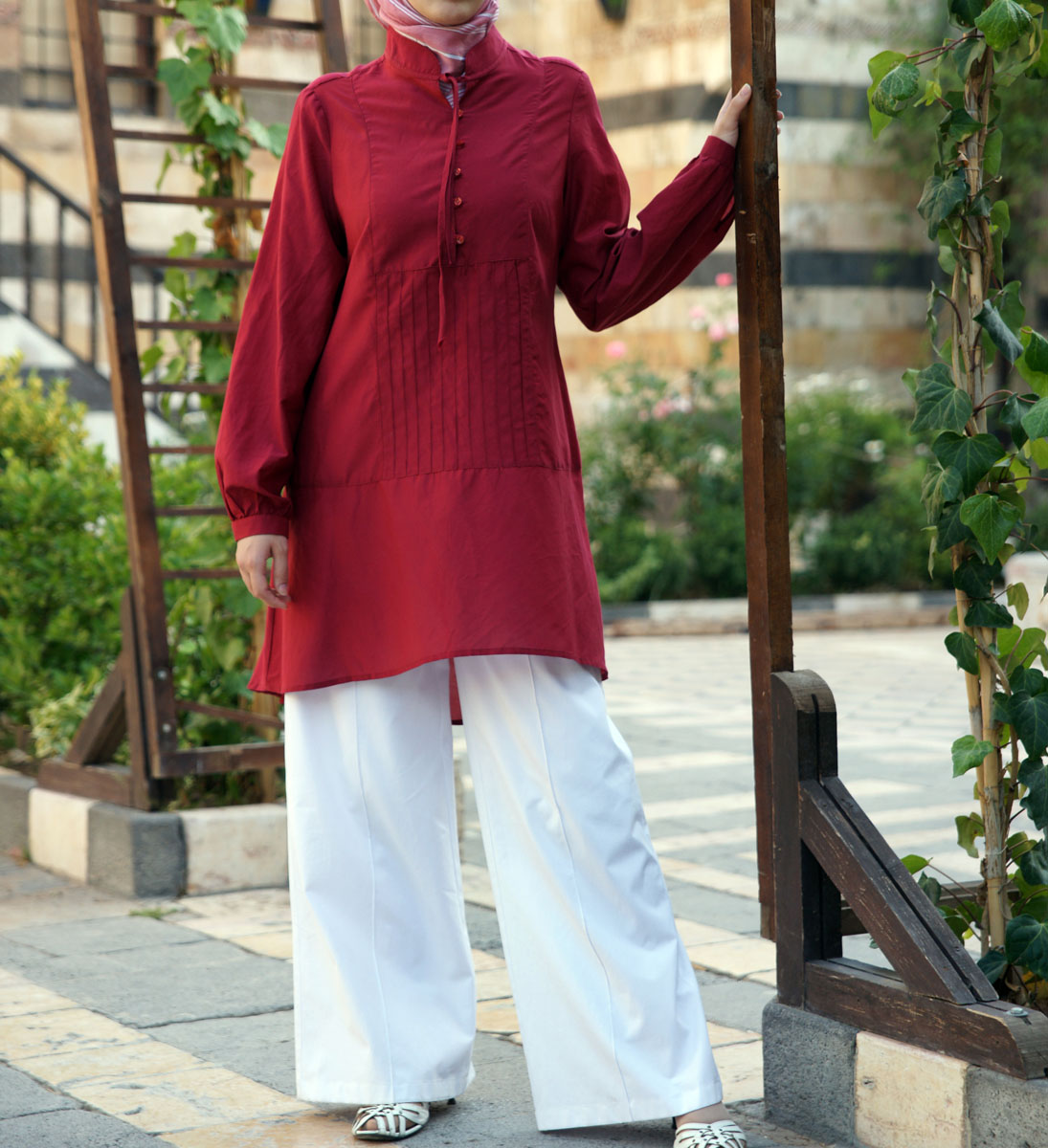 Description: mid-thigh length from front and knee length from behind; open mandarin collar with ties; buttoned neck opening with button loops; buttoned cuffs with gathers; bib and cuffs; pintucks below bib. Imported.