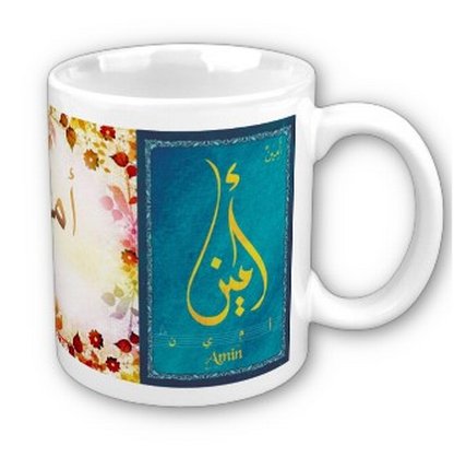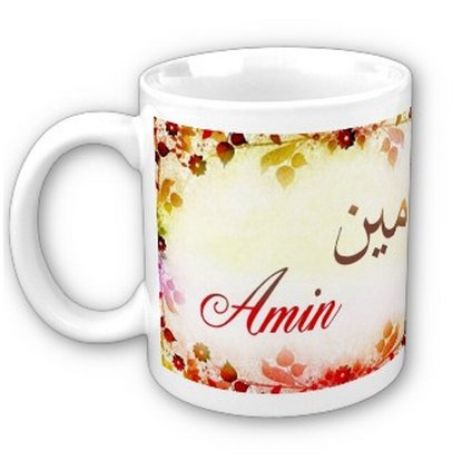 Mug avec le prénom Amine calligraphié en arabe (امين) ainsi que son épellation lettre par lettre en arabe.