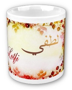 Mug avec le prénom "Lotfi" calligraphié en arabe (لطفي) ainsi que son épellation lettre par lettre en arabe.
