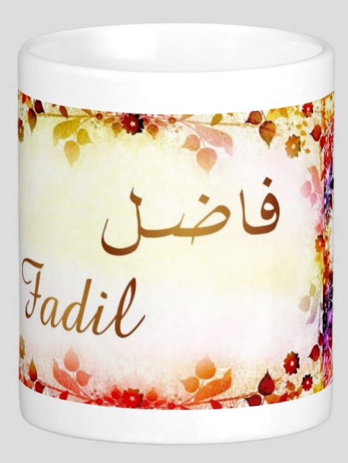 Mug avec le prénom "Fadil" écrit en français, en arabe (فاضل) et calligraphié de façon artistique en arabe sur la partie droite.