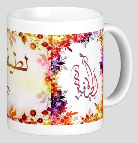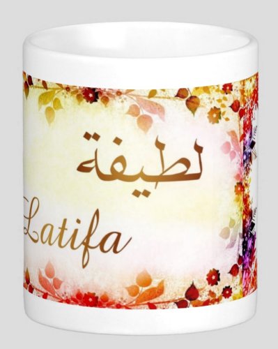 Mug avec le prénom "Latifa" écrit en français, en arabe (لطيفة) et calligraphié de façon artistique en arabe sur la partie droite.