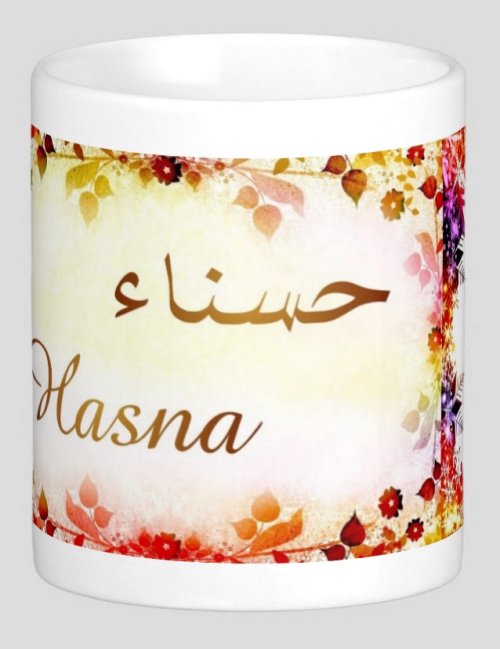 Mug avec le prénom "Hasna" écrit en français, en arabe (حسنة) et calligraphié de façon artistique en arabe sur la partie droite.