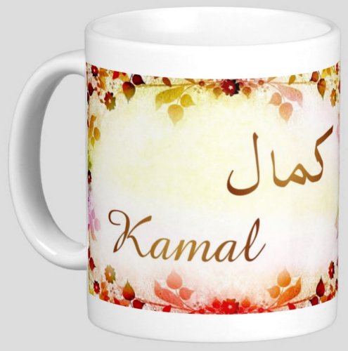 Mug avec le prénom "Kamal" écrit en français, en arabe (كمال) et calligraphié de façon artistique en arabe sur la partie droite.