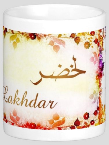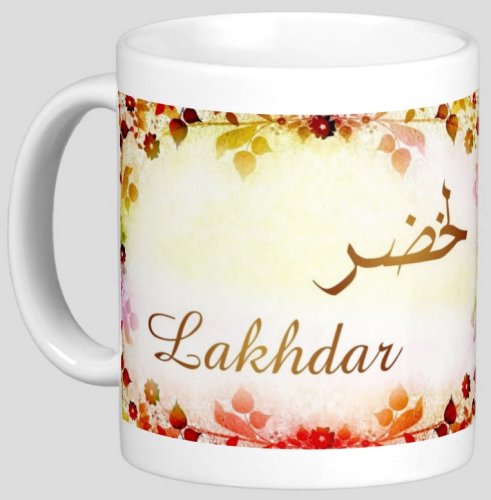 Mug avec le prénom "Lakhdar" écrit en français, en arabe (لخضر) et calligraphié de façon artistique en arabe sur la partie droite.