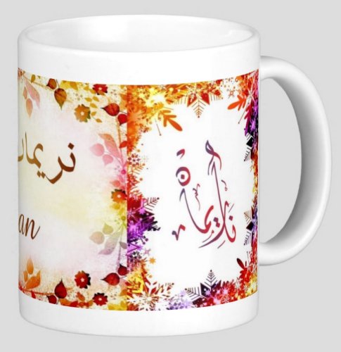 Mug avec le prénom "Nariman" écrit en français, en arabe (نرمان) et calligraphié de façon artistique en arabe sur la partie droite.