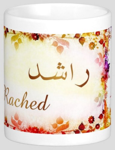 Mug avec le prénom "Rached" écrit en français, en arabe (راشد) et calligraphié de façon artistique en arabe sur la partie droite.