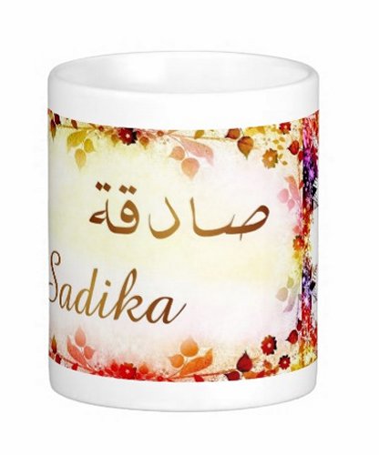 Mug avec le prénom "Sadika" écrit en français, en arabe (صادقة) et calligraphié de façon artistique en arabe sur la partie droite.