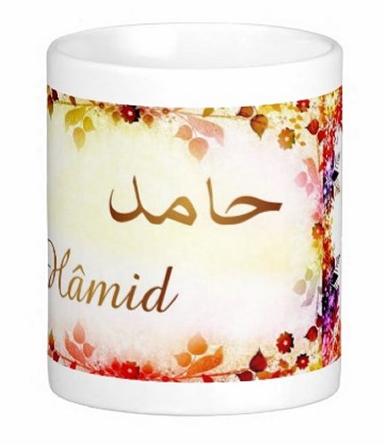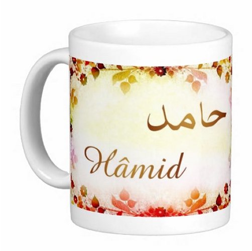 Mug avec le prénom "Hâmid" écrit en français, en arabe (حامد) et calligraphié de façon artistique en arabe sur la partie droite.