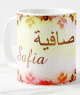 Mug avec le prénom "Noella" écrit en français, en arabe (نويلا) et calligraphié de façon artistique en arabe sur la partie droite.