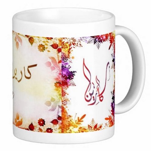 Mug avec le prénom "Karine" écrit en français, en arabe (كارين) et calligraphié de façon artistique en arabe sur la partie droite.