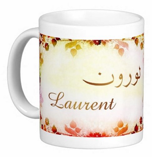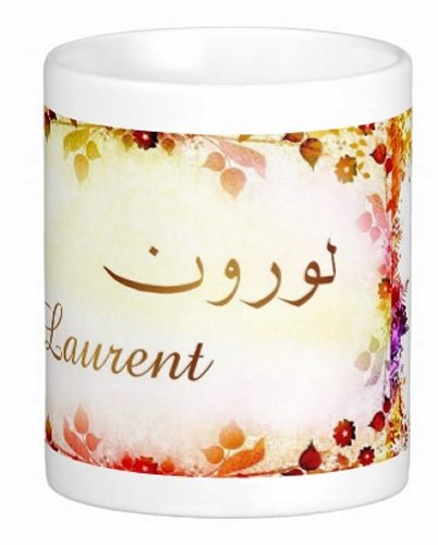 Mug avec le prénom "Laurent" écrit en français, en arabe (لورون) et calligraphié de façon artistique en arabe sur la partie droite.