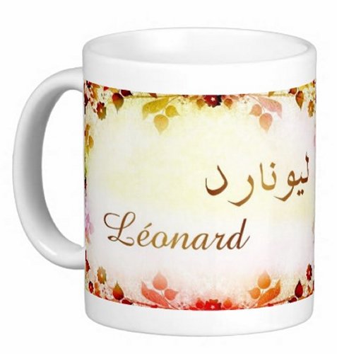 Mug avec le prénom "Léonard" écrit en français, en arabe (ليونارد) et calligraphié de façon artistique en arabe sur la partie droite.