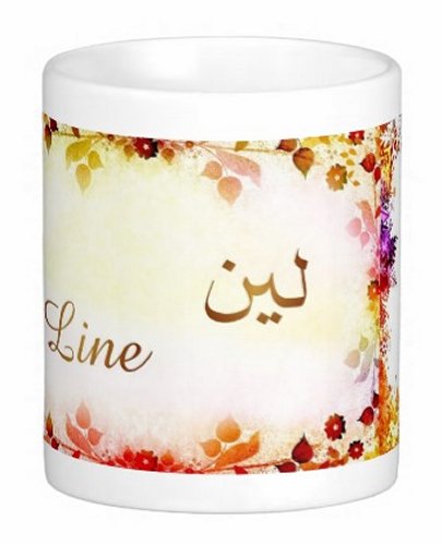 Mug avec le prénom "Line" écrit en français, en arabe (لين) et calligraphié de façon artistique en arabe sur la partie droite.