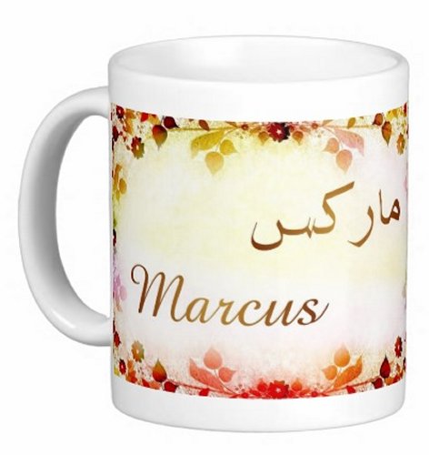 Mug avec le prénom "Marcus" écrit en français, en arabe (ماركس) et calligraphié de façon artistique en arabe sur la partie droite.