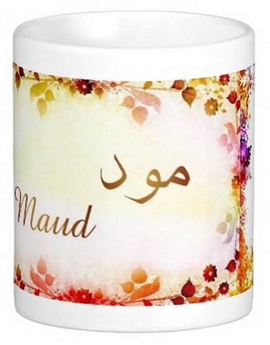 Mug avec le prénom "Maud" écrit en français, en arabe (مود) et calligraphié de façon artistique en arabe sur la partie droite.
