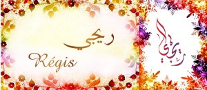 Mug avec le prénom "Régis" écrit en français, en arabe (ريجي) et calligraphié de façon artistique en arabe sur la partie droite.