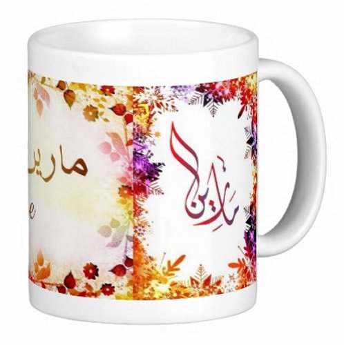 Mug avec le prénom "Maryne" écrit en français, en arabe (مارين) et calligraphié de façon artistique en arabe sur la partie droite.