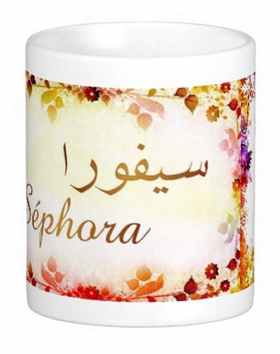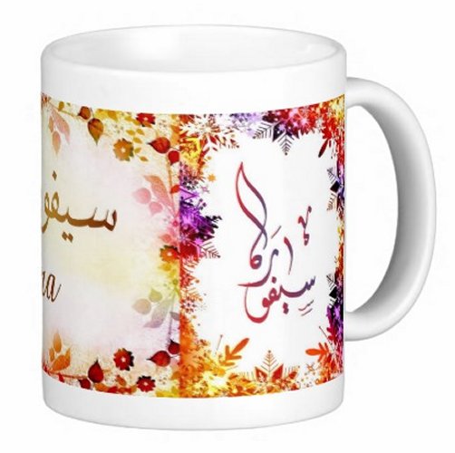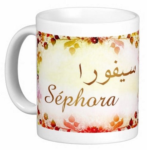 Mug avec le prénom "Séphora" écrit en français, en arabe (سيفورا) et calligraphié de façon artistique en arabe sur la partie droite.