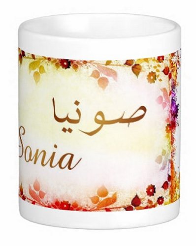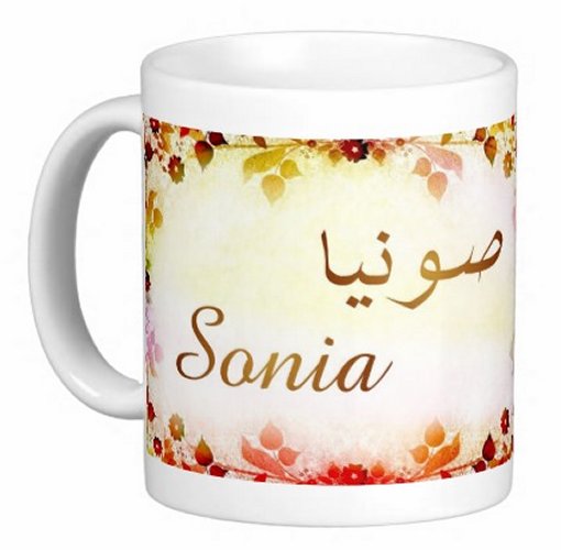 Mug avec le prénom "Sonia" écrit en français, en arabe (صونيا) et calligraphié de façon artistique en arabe sur la partie droite.