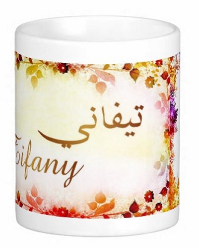 Mug avec le prénom "Tifany" écrit en français, en arabe (تيفاني) et calligraphié de façon artistique en arabe sur la partie droite.