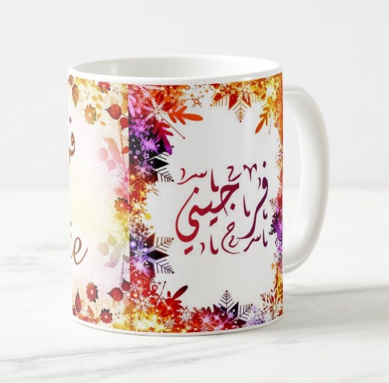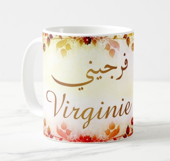 Mug avec le prénom "Virginie" écrit en français, en arabe (فرجيني) et calligraphié de façon artistique en arabe sur la partie droite.