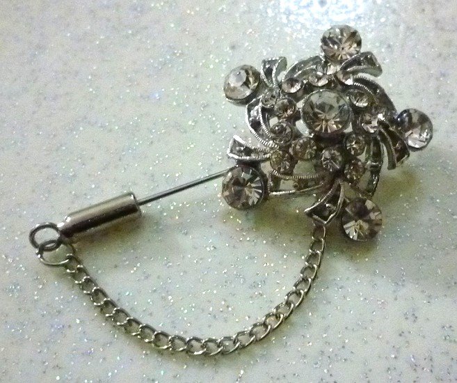 Broche pour Hijab argentée en forme de fleur, agrémentée de pierres diamantées (6 grosses et 15 petites).