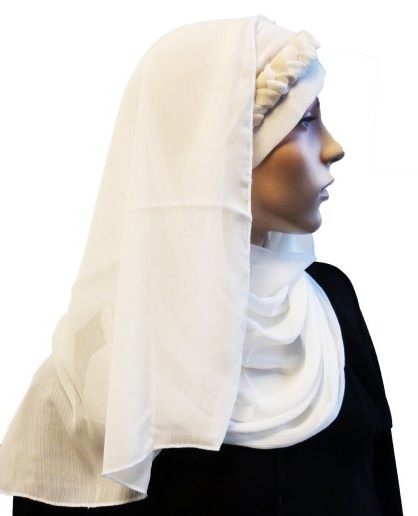 Hijab 1 pièce blanc cassé matière crêpe orné d'une tresse tissée. Le tout agrémenté d'un ruban satiné pour attacher le hijab par derrière. Modèle original et léger à porter.