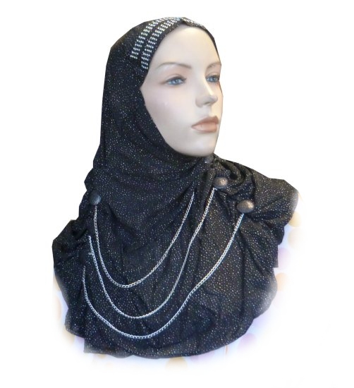 Hijab 1 pièce noir pailleté avec bonnet décoré de strass. Le tout accommodé de trois boutons de chaque coté et de trois fines chaines argentées.