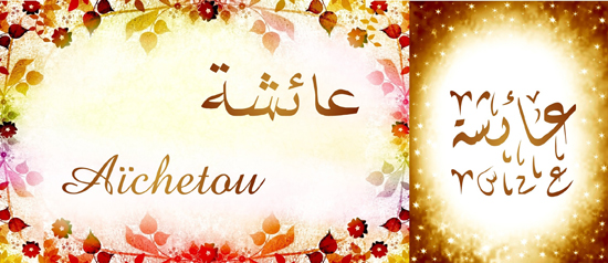 Signification (sens) du prénom Aïchetou عائشة: Aïchetou vient de ‘A’isha qui signifie Vivante, pleine de vitalité. ‘A’isha surnommé Mère des croyants, fille d’Abû Bakr et épouse favorite du Prophète.