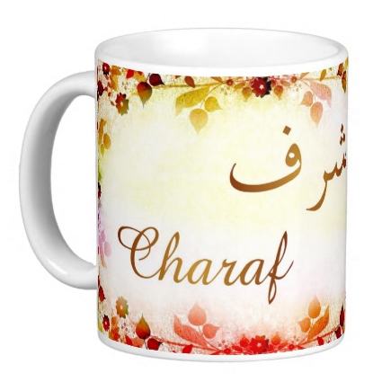 Mug avec le prénom "Charaf" écrit en français, en arabe (شرف) et calligraphié de façon artistique en arabe sur la partie droite.