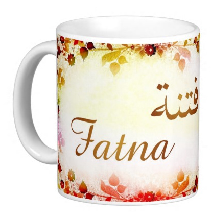 Mug avec le prénom "Fatna" écrit en français, en arabe (فتنة) et calligraphié de façon artistique en arabe sur la partie droite.