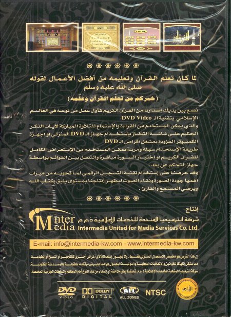 Le Saint Coran en DVD permet d'écouter et de voir en parallèle le texte du Saint Coran sur votre téléviseur (via un lecteur DVD de salon) ou sur votre PC (s'il est muni d'un lecteur DVD intégré). La lecture est celle du Cheikh AbdulRahman Al Sudais et Cheikh Saoud Al-Shuraim avec un son Dolby Digital comme si vous étiez à la mosquée sacrée de la Mecque.