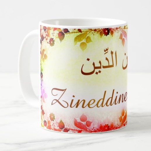 Mug avec le prénom "Zineddine" écrit en français, en arabe (زين الدين) et calligraphié de façon artistique en arabe sur la partie droite.
