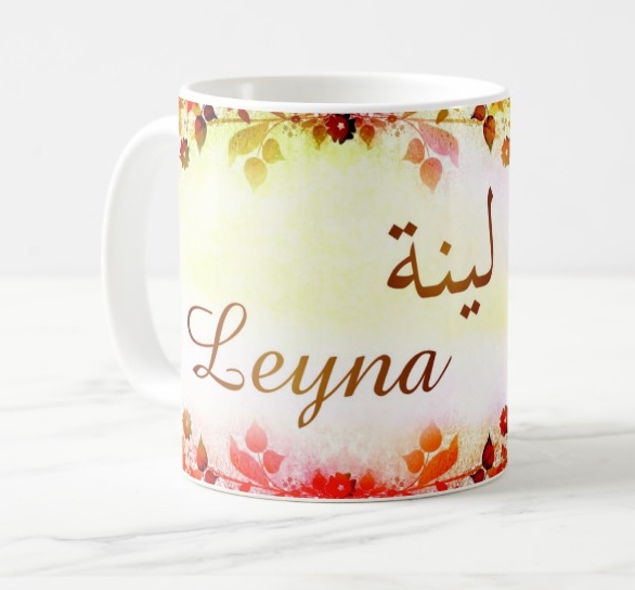 Mug avec le prénom "Leyna" écrit en français, en arabe (لينة) et calligraphié de façon artistique en arabe sur la partie droite.