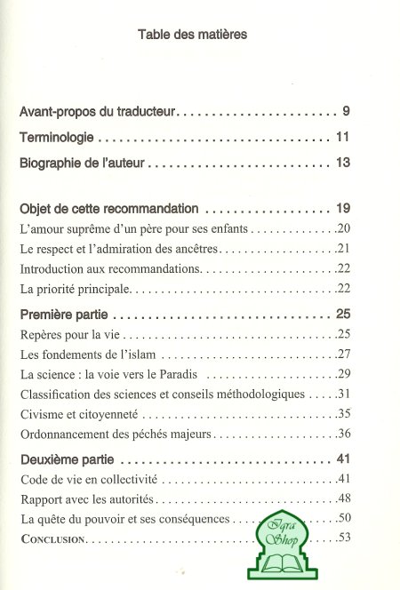 Si cette Wassiya est l'oeuvre d'un père pour ses deux fils, elle devrait être celle de tout homme soucieux de l'éducation et du devenir de ses enfants ici-bas et dans l'au delà. L'auteur nous expose de manière remarquable sa recommandation en s'appuyant sur des versets coraniques et la tradition prophétique, mais aussi sur sa riche expérience de la vie, empreinte de piété, de science et de sagesse.