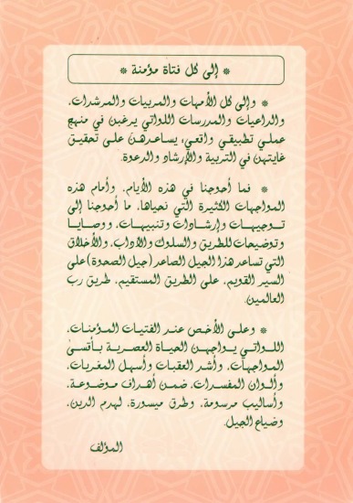 الى كل الأمهات والمربيات والمرشدات, والداعيات والمدرسات اللواتي يرغبن في منهج عملي تطبيقي واقعي, يساعدهن على تحقيق غايتهن في التربية والإرشاد والدعوة. فما أحوجنا في هذه الأيام, أمام هذه المواجهات الكثيرة التي نحياها, ما أحوجنا الى توجيهات وإرشادات وتنبيهات, ووصايا وتوضيحات للطريق والسلوك والآداب, والأخلاق التي تساعد هذا الجيل الصاعد (جيل الصحوة) على السير القويم, على الطريق المستقيم, طريق رب العالمين. وعلى الأخص عن الفتيات المؤمنات, اللواتي يواجهن الحياة العصرية بأقسى المواجهات, وأشد العقبات وأسهل المغريات, وألوان المفسدات, ضمن أهداف موضوعة, وأساليب مرسومة, وطرق ميسورة, لهدم الدين, وضياع الجيل. وكان من أهم الوصايا التي تناولها: اختيار الزوج, معاملة الخطيب, ليلة الزفاف, كيف تكونين زوجة صالحة, الحمل والولادة والرضاعة, مسؤوليتك في تربية أطفالك, وغيرها من الوصايا الهامة.