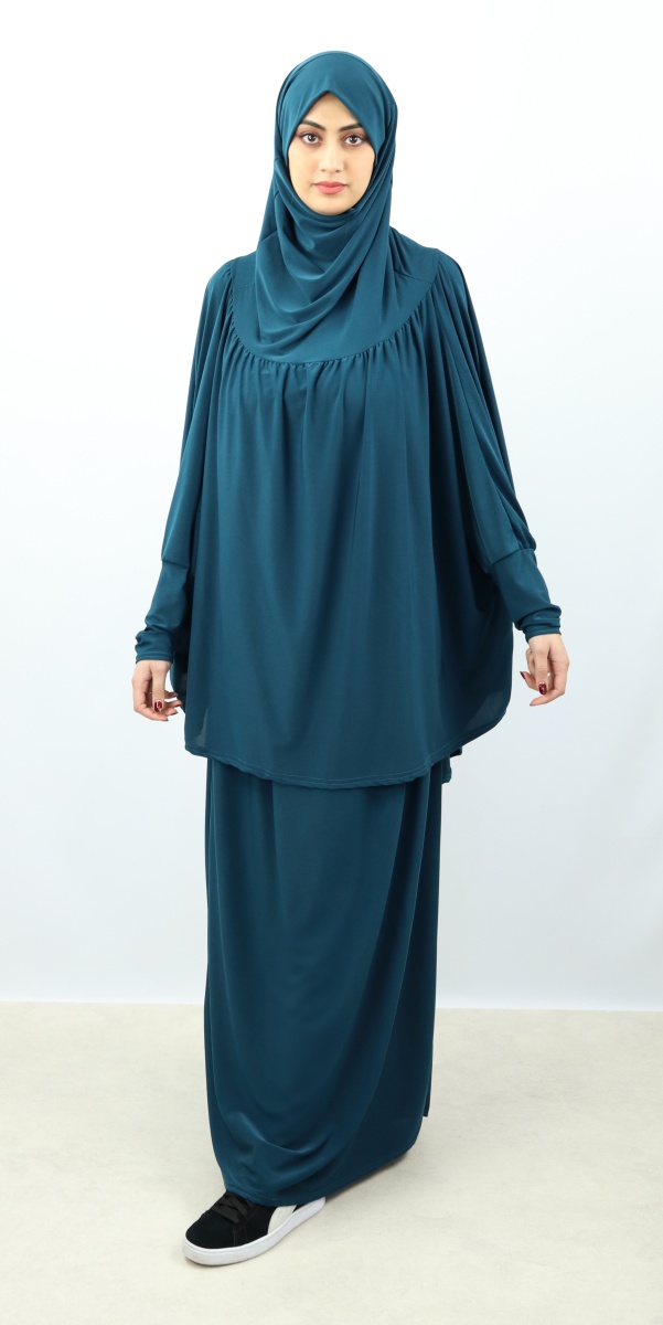 Jilbab deux pièces (cape avec bandeau intégré + jupe) de taille standard large avec tissu extensible passe partout. S'enfile rapidement, tissu fluide. Ce jilbeb est idéal pour faire du sport...
