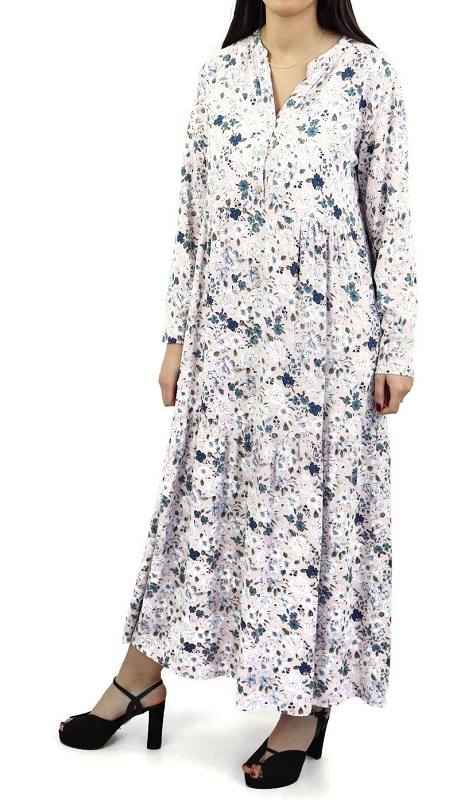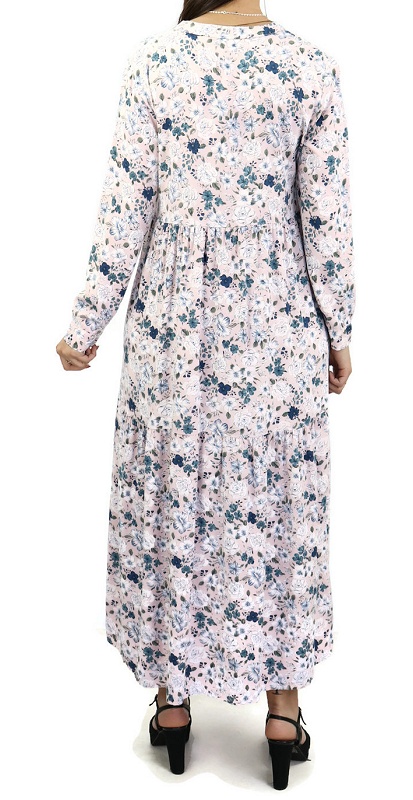 Robe rose pale avec motifs fleurs variés.