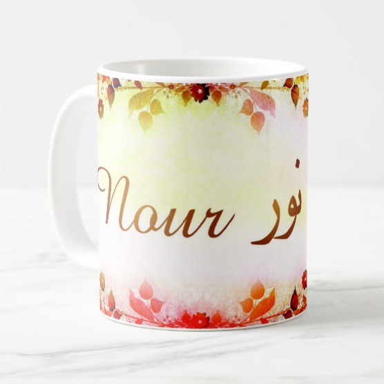 Mug avec le prénom Nour calligraphié en arabe ainsi que son écriture normale en arabe (نور) et en français.