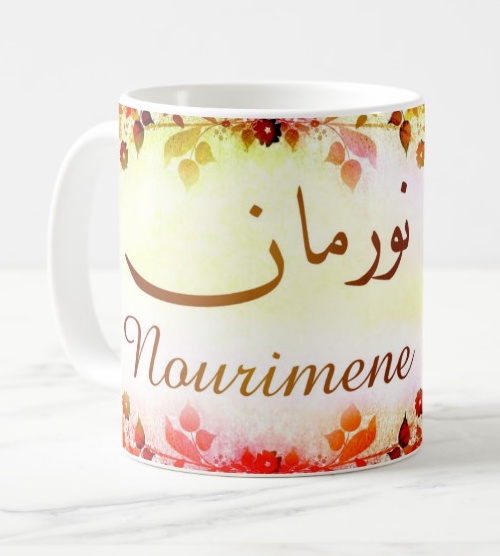Mug avec le prénom Nourimene calligraphié en arabe ainsi que son écriture normale en arabe (نورمان) et en français.