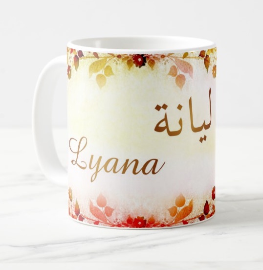 Mug avec le prénom Lyana calligraphié en arabe ainsi que son écriture normale en arabe (ليانة) et en français.