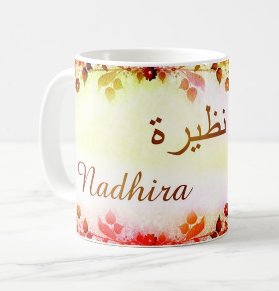 Mug avec le prénom Nadhira calligraphié en arabe ainsi que son écriture normale en arabe (نظيرة) et en français.