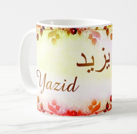 Mug avec le prénom Yazid calligraphié en arabe ainsi que son écriture normale en arabe (يزيد) et en français.