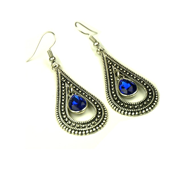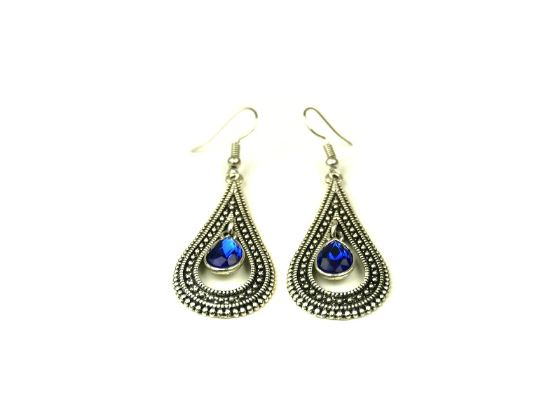 Boucles d'oreilles pendantes, style berbère, fabriquées en métal argenté - composition argent - délicatement ciselé, serties de pierres bleu roi.