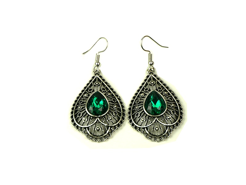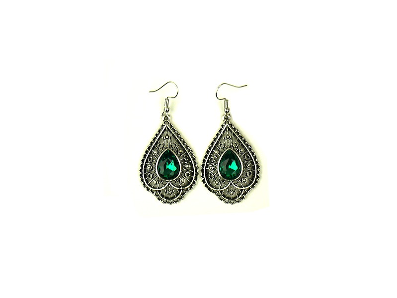 Boucles d'oreilles pendantes, style berbère, fabriquées en métal argenté - composition argent - délicatement ciselé, serties de pierres vert.
