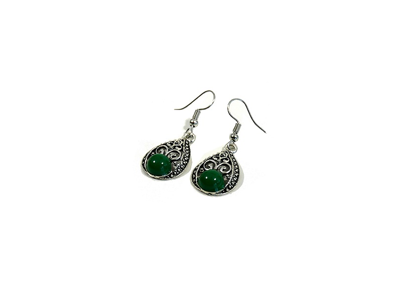 Boucles d'oreilles pendantes, style berbère, fabriquées en métal argenté - composition argent - délicatement ciselé, serties de pierres vert foncé.