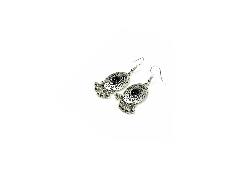 Boucles d'oreilles pendantes, style berbère, fabriquées en métal argenté - composition argent - délicatement ciselé, serties de pierres noir.